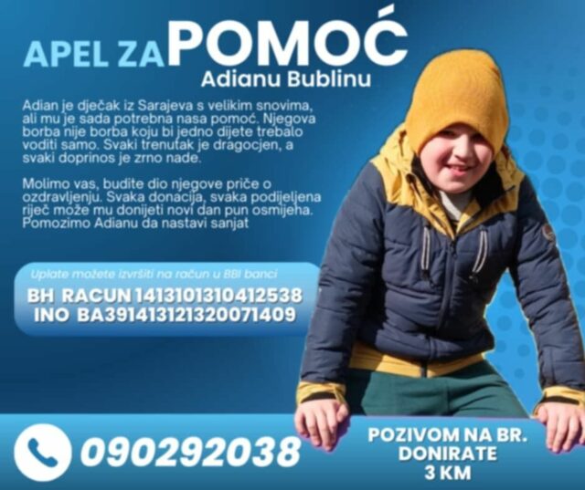 – Kao i sva djeca i Adian ima svoje snove, ali sada mu je potrebna pomoć ljudi dobrog srca. Njegova borba nije borba koju bi jedno dijete trebalo voditi samo. Svaki trenutak je dragocjen, a svaki doprinos je zrno nade. Molimo sve ljude dobre volje da budu dio njegove priče o ozdravljenju. Svaka donacija, svaka podijeljena riječ može mu donijeti novi dan pun osmijeha. Pomozimo Adianu da nastavi sanjati – stoji u apelu za pomoć.