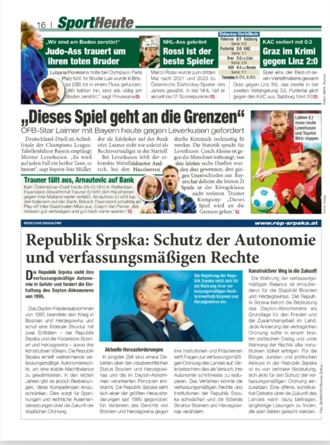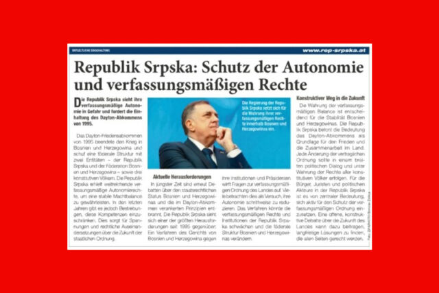 Nakon što je ‘iznajmio’ Rudya Giuliania, Dodik je danas u najvećem austrijskom besplatnom dnevnom listu, tabloidu Heute, platio oglas pod nazivom “Republika Srpska: Zaštita autonomije i ustavnih prava”.