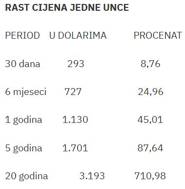 Ukoliko se, međutim, kao reper uzmu cijene od prije pet godina, to znači da bi vrijednost ovog plemenitog metala tokom naredne godine mogla biti veća za 2.000 pa i 3.000 dolara po jednoj unci.
