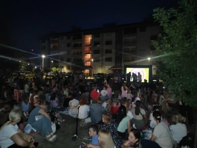 Sinoć je igralište na Pećanima postalo pravo malo kino pod vedrim nebom. Između stambenih zgrada postavljen je veliki projektor, a djeca su, naoružana dekicama i osmijehom, zauzela svoja mjesta na travi.