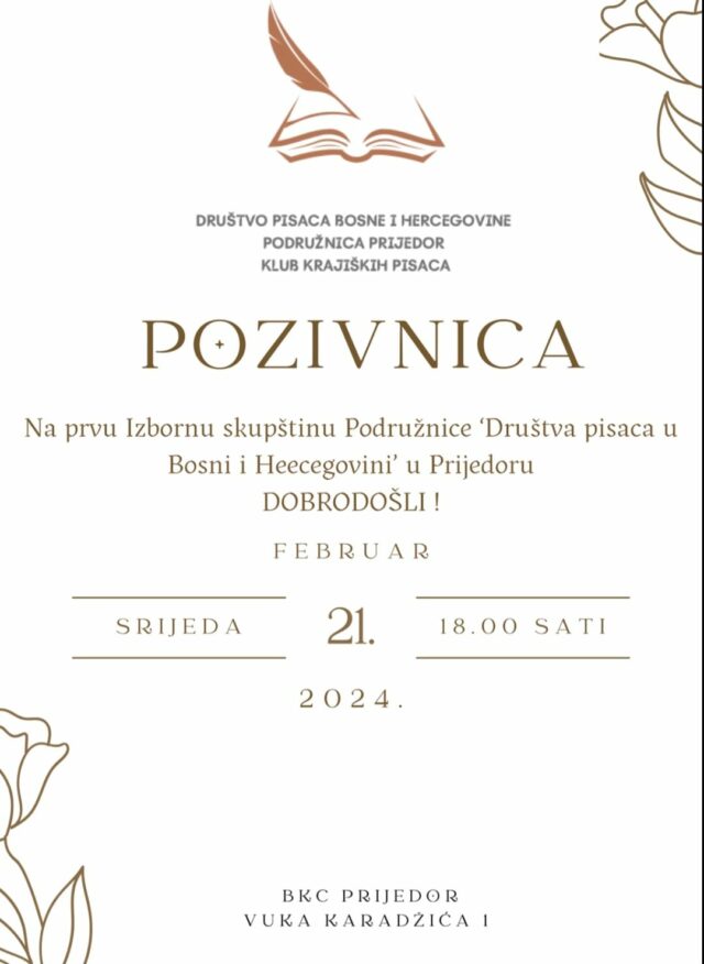 Ispred Kluba krajiških pisaca, sada i zvanično Podružnice Društva pisaca BiH, pozivamo sve zainteresovane da nam se pridruže na Izbornoj skupštini koja će se održati u Prijedoru 21. februara sa početkom u 18 sati u prostorijama Bosanskog kulturnog centra Prijedor, ulica Vuka Karadžića 1.