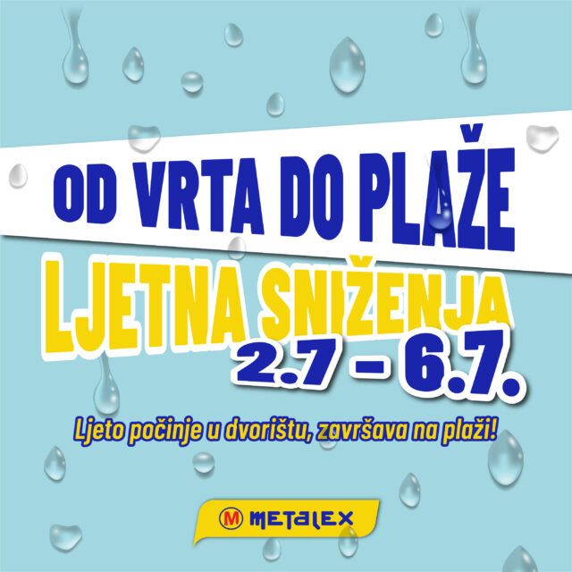 U okviru akcije “Od vrta do plaže – ljetna sniženja”, u svim Metalex maloprodajama, kupce očekuju popusti do -20% na odabrane grupe proizvoda. Sniženi su vrtni i plažni program, vrtni namještaj, roštilji, hrana i oprema za kućne ljubimce, sadnice, sjemena, pčelarska i vinogradarska oprema, vrtni alati, pumpe za vodu i auto program.