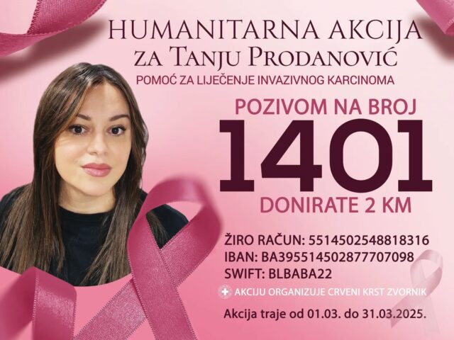 Pozivom na broj 1401 donirate pomoć Tanji Prodanović u borbi sa invanzivnim karcinomom. Tanja je jedna od nas, majka i supruga, žena borac i velikog srca. Na svom Fejsbuk profilu Tanja Prodanović nije samo objavila da joj je neophodna naša pomoć i podrška, već i da ista pomoć treba i njenoj sugrađanki Slađani.