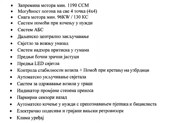 U tenderskoj dokumentaciji navedene su detaljne tehničke specifikacije. Uglavnom, sva vozila trebaju biti bijele boje, putnička i kombi sa dizelskim, a terenci sa pogonom na benzin.