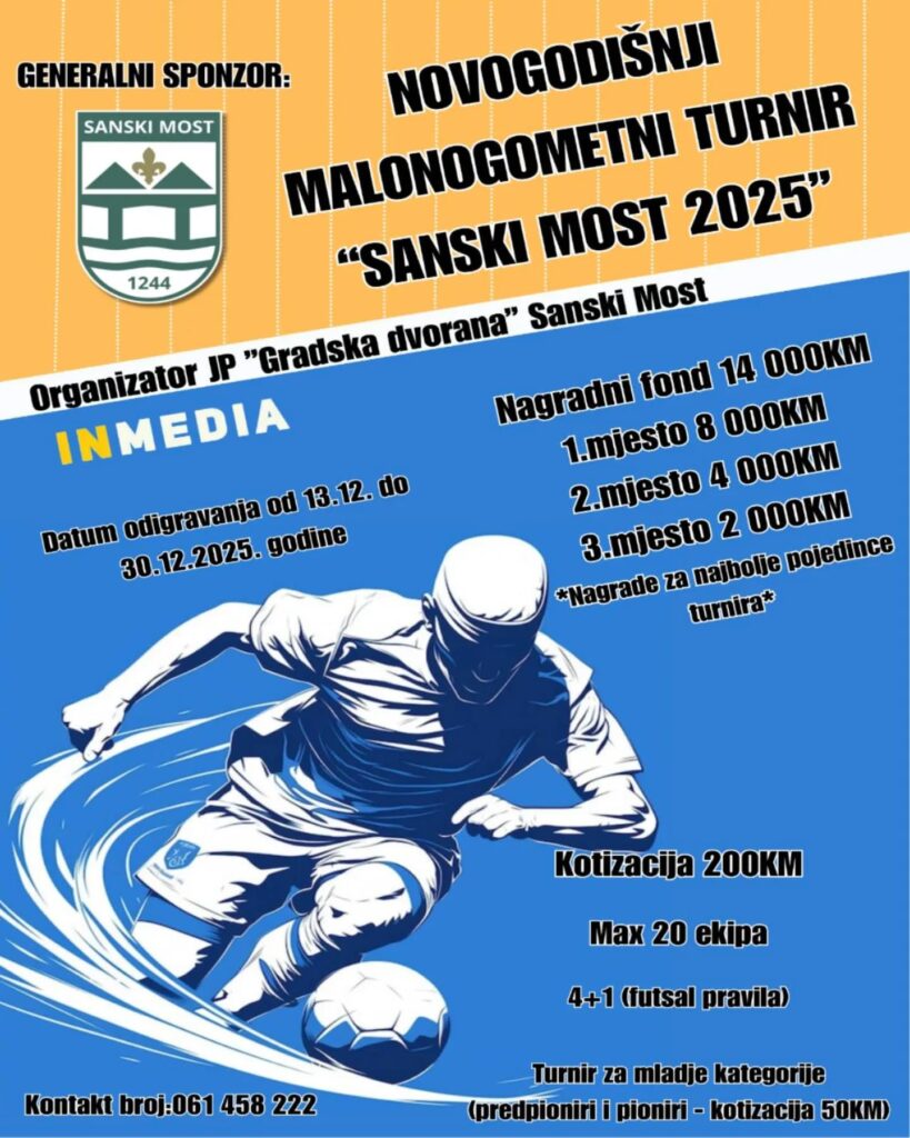 Još samo nekoliko dana ostalo je za prijave na novogodišnji malonogometni turnir “Sanski Most 2025” kojeg i ove godine organizuje Javno preduzeće “Gradska dvorana”. Broj ekipa je ograničen na maksimalno 20, a organizator i ovaj put najavljuje dopadljiv i uzbudljiv nogomet, te brojna iznenađenja i bogate nagrade za publiku.