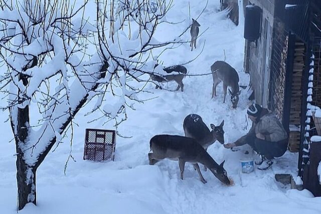 Zanimljiv prizor zabilježen je jutros na Palama gdje su četiri srne i srndać prišle čovjeku i jele mu iz ruke.