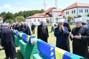 Kolektivna dženaza za sedam žrtava s područja Prijedora klanjana je jučer u Memorijalnom centru Kamičani.