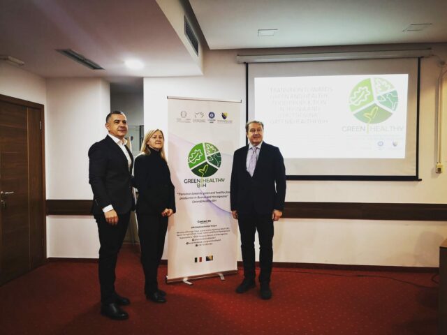 Pomoćnik ministra Saša Lalić i načelnik odjeljenja za organsku proizvodnju Dragana Zec danas u Banjaluci u okviru projekta “Tranzicija ka zelenoj i zdravoj proizvodnji hrane u BiH” prezentovali su aktivnosti Ministarstva poljoprivrede, šumarstva i vodoprivrede RS koje su za cilj imale implementaciju dokumenata EU Zelene agende i strategije “Od njive do trpeze”.