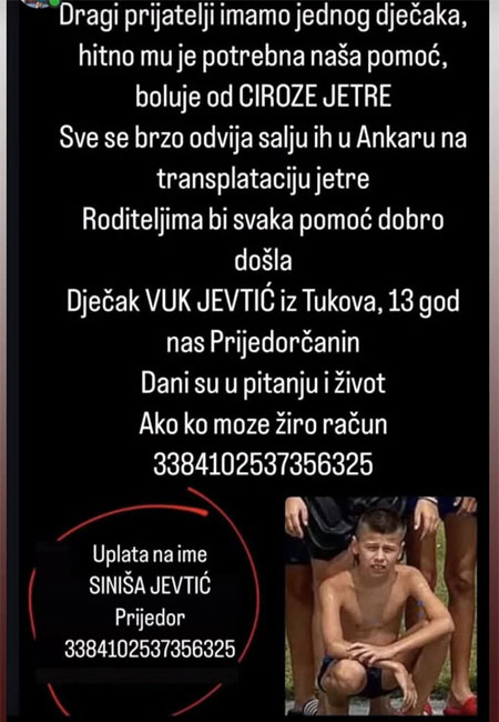 Fond je na društvenim mrežama podijelio objavu da dječak boluje od ciroze jetre, da mu je potrebna transplantacija, da će liječenje trajati tri mjeseca u Istanbulu, a roditeljima su potrebna sredstva za život, te da je za tu namjenu svaka pomoć dobrodošla.
