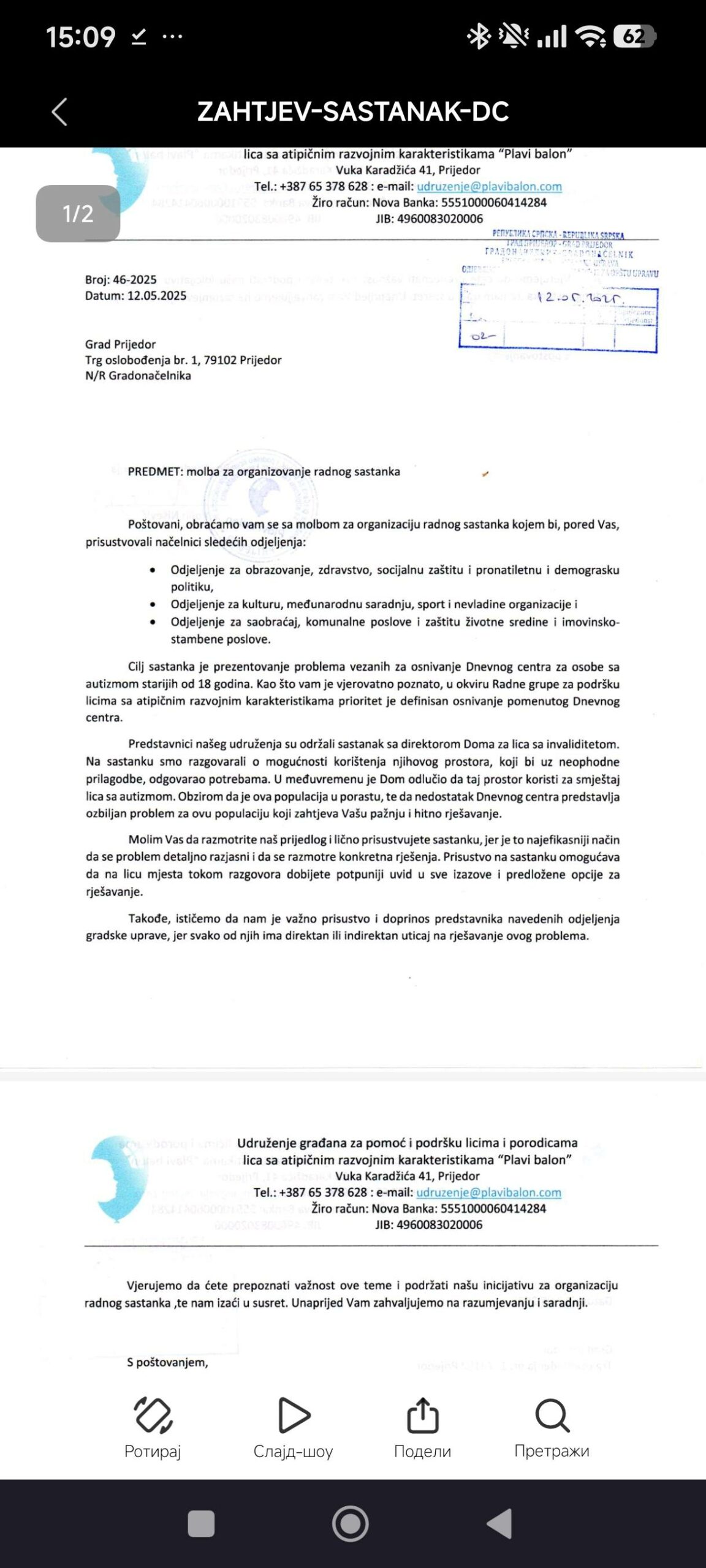 Od sastanka sa gradskom upravom vezano za dnevni centar proslo je vise od godinu dana, do dana danas niko nas nije kontaktirao,iako smo kao sto mozete vidjeti trazili sastanak da vidimo da li se sta razmotrilo u vezi ideje dnevnog centra do ponovnog sastanka nije doslo i pored sigurno2-3 poziva pored dopisa koje vidite…