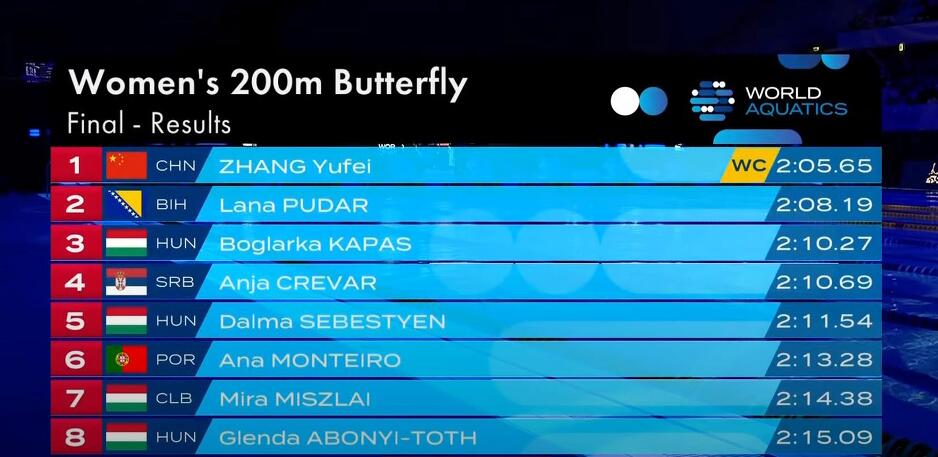 Yufei je bila brža od Lane za dvije i po sekunde, a bh. sirena je trećeplasiranu Boglarku Kapas iza sebe ostavila za više od dvije sekunde.