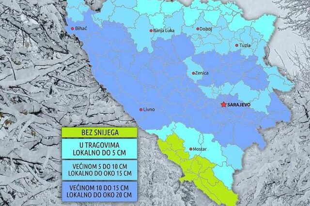 “U subotu, 20.01.2024., prije podne snijega bi bilo u centralnim i istočnim područjima Bosne i većem dijelu Hercegovine. Na krajnjem jugu se očekuje susnježica ili kiša. U drugom dijelu dana širom zemlje smanjenje oblačnosti. Vjetar u većem dijelu Bosne slab do umjerene jačine sjeveroistočnog smjera. U Hercegovini i jugozapadu Bosne jaka bura. Najniža jutarnja temperatura zraka većinom između -5 i -1°C, na jugu od 2 do 5°C. Najviša dnevna temperatura zraka uglavnom između -2 i 2°C, na jugu do 8°C”, prognoza je FHMZ za subotu.