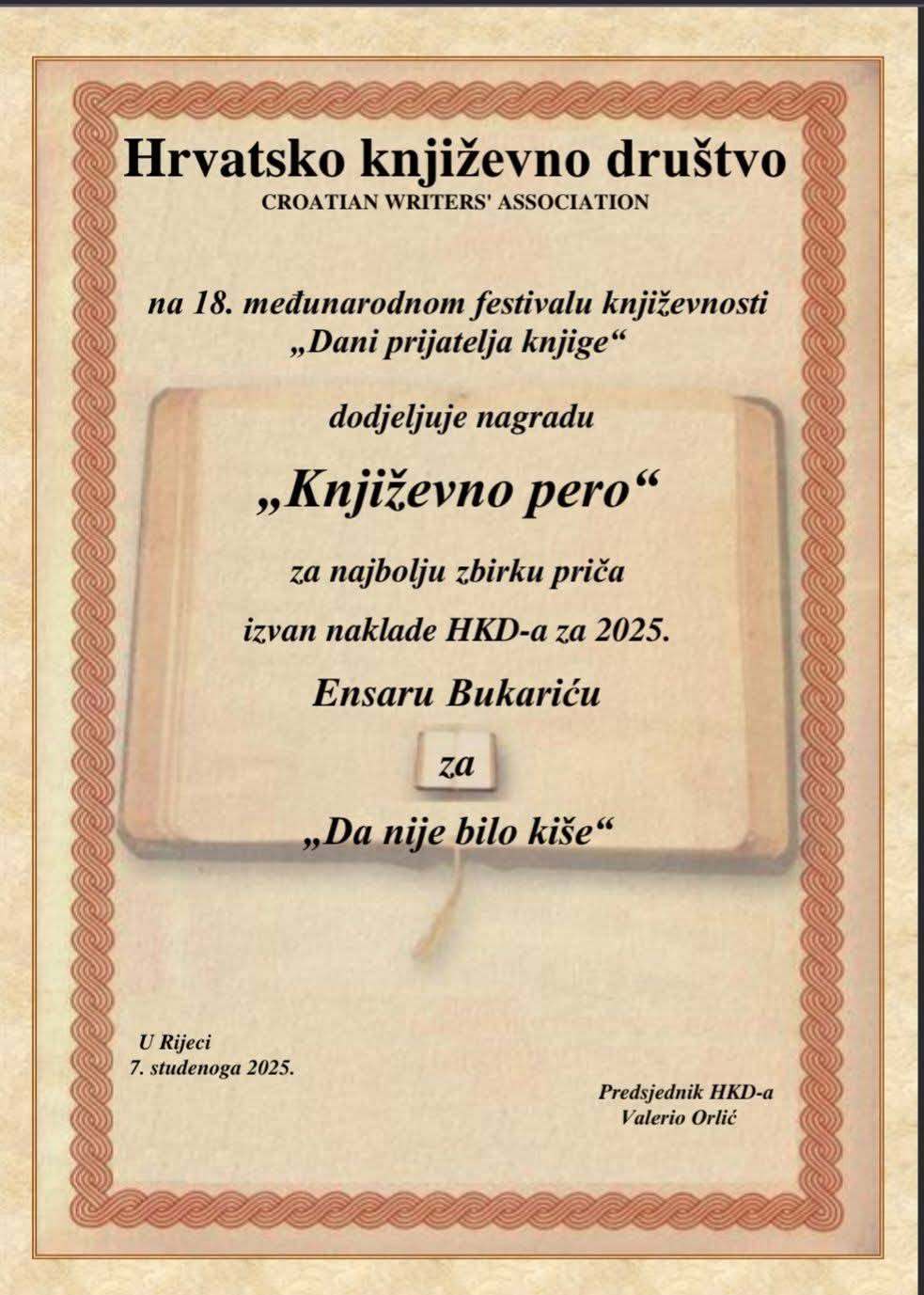 Knjiga “Da nije bilo kiše” autora Ensara Bukarića, u izdanju Bosanskog kulturnog centra Prijedor, osvojila je prestižnu nagradu Hrvatskog književnog društva “Književno pero” za najbolju zbirku priča objavljenu izvan naklade HKD-a u 2025. godini.