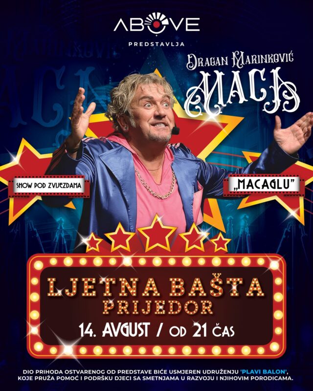 U organizaciji agencije „Above“ ovog ljeta u Prijedoru će nastupiti jedan od najpoznatijih glumaca i šoumena Dragan Marinković Maca. Ovaj događaj biće održan u četvrtak, 14. avgusta u Ljetnoj bašti s početkom u 21:00 h. Dio prihoda od prodanih ulaznica biće usmjeren Udruženju građana „Plavi balon“.